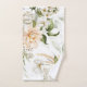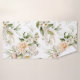 Elegante Blumenhandtücher mit weichen, pastellfarbenen Blumen und grünen Blättern, die an einer hellen Wand ausgestellt sind. Eines ist aufgehängt, das andere gefaltet, was eine ruhige Atmosphäre schafft.
