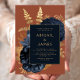 Dieses elegante, stimmungsvolle Hochzeitsinklusive besticht durch ein romantisches Blumenstrauß in Marineblau mit Goldfolie und Glitzer-Blattwerk auf einem verbrannten, orangefarbenen Hintergrund. Passen Sie den goldfarbenen Text in stilvollen Schriftart auf einem dunkelblauen Rechteck an. Die Rückseite der Karte ist massiv dunkelblau.
