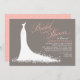 Die elegante Brautdusche lädt zur stilvollen Braut-to-be-Braut mit einem verzierten Kalligraphie-Script-Schriftart und fließendem Hochzeitskleid ein. Scroll blüht, Blume und Schmetterlingdetails beleuchten das ätherische Kleid. Weiß, rot/korallenrosa und warme, zinngraue Designfarben.