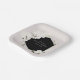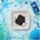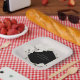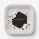 Elegante Bohemische Teller aus Blumenpapier. Weiße Aquarellfarben und zartes grünes Blattwerk, schwarzer geometrischer Rahmen.