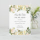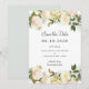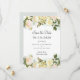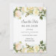 Elegante schicke botanische Save the Date-Karte mit romantischen, weißen Vanille-Hochzeitszimmern mit Farbtupfern, die auf einem zeitlosen, weißen Hintergrund in üppiger Vegetation dargestellt sind. Persönliche Hochzeitsdetails für Ihre Gäste in elegantem Holzkohle-Grau-Schrift und Schrift. Die Rückseite der Karte ist weich grün. Bitte kontaktieren Sie mich unter invitationsuites@gmail.com wenn Sie Fragen zu diesem oder einem unserer Designs haben.