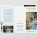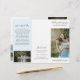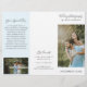 Moderne Fotografie-Trifold-Broschüre mit einem Foto auf der Vorderseite mit Ihrem Firmennamen oben und dem Prospekttitel unten auf weißem Hintergrund. Das äußere Backpanel enthält Ihre Kontaktdaten mit dem Header in einem eleganten, handgeschriebenen Schriftart. Das Innenklappenfeld verfügt über eine Informationsvorlage sowie ein Foto unten auf einem pastellblauen Hintergrund. Das Innere hat ein Bild auf den links und rechten Paneelen mit einer Vorlage für Informationen über die verlassen, Ihre Pakete in der Mitte und eine A-la-carte Preisliste auf der rechten Seite. Diese berufliche Dreierbroschüre eignet sich perfekt für Hochzeitsfotografen.