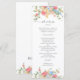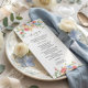 Verleihen Sie Ihren Rezeptionstischen mit dieser eleganten Wildblumen-Hochzeits-Speisekarte eine romantische, garteninspirierte Note. Die zarten Wasserfarbenblüten in sanften Rosa-, Blau- und Goldtönen oben und unten umrahmen Ihre Menüauswahl mit zeitloser floraler Eleganz.