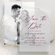 Set den Ton für Ihre Hochzeit mit unserem eleganten Vellum speichern Sie die Dattelkarten. Dieses Design zeichnet sich durch "Save the Date" in raffinierter bordeauxfarbener Kalligraphie auf einem schieren Vellum-Hintergrund aus, die zeitlose Schönheit mit einer modernen Touch verbindet. Paare können die Karte mit ihren Namen, ihrem Hochzeitstermin, ihrem Standort und ihrer Hochzeitswebsite in fett bordeauxfarbener Schrift personalisieren, um sicherzustellen, dass Ihre wichtigen Details sowohl stilvoll als auch leicht lesbar sind. Diese individuell gestaltbaren Vellumkarten sind perfekt für einen bleibenden Eindruck geeignet und bieten eine raffinierte und zeitgemäße Art, Ihren besonderen Tag für Familie und Freunde zu verkünden.