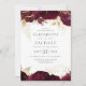 Ein elegantes botanisches Design mit bordeauxroten, blumengeschmückten Rändern oben und unten, besticht durch goldene Imitate und Blätter aus Glitzer, die den klassischen Holzkohle-Grautext auf weißem Hintergrund abbilden. Auf der Rückseite der Karte wird ein passendes Blumendesign angezeigt.