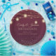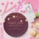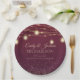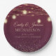 Hochzeitspapier-Teller in einer eleganten Bordeaux mit goldenem Glitzer und Streichelleuchten und Laternen. Personalisieren Sie die Namen des Paares, das Hochzeitsdatum und den Ort.