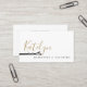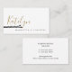 Elegante, anpassbare Visitenkartenvorlage mit weißem Hintergrund, coolen IMITATEN goldenen Schriftart und schwarzem Button-Symbol. Einfaches elegantes Design, perfekt für Schönheitssalon, Friseur.