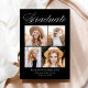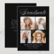 Elegante Abschluss-Ankündigung mit "Graduate" oben in einem weißen Kalligraphieskript mit schwarzem Hintergrund angezeigt. Das Design besteht aus vier Fotos des Absolventen, die in einem Collage-Stil mit dem Namen, dem Namen der Schule und dem Jahr des Abschlusses dargestellt sind. Die Ankündigung des 4-Foto-Abschlusses kehrt zurück, um optionalen Text wie z.B. Zukunftspläne, Angaben zur Graduierungspartei usw. anzuzeigen. Die schicke Ankündigung des Abschlusses ist ideal, um den Abschluss von Absolventen der Oberstufe und der Uni anzukündigen.
