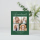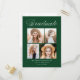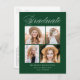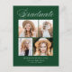 Elegante Graduierungsparty Einladung Postkarten mit "Graduate" oben in einem weißen Kalligraphieskript mit grünem Hintergrund angezeigt. Das Design besteht aus vier Fotos des Absolventen, die in einem Collage-Stil mit dem Namen, dem Namen der Schule und dem Jahr des Abschlusses dargestellt sind. Die 4 Foto Graduation Party Postcard laden Umkehrungen, um Ihre Rücksendeadresse Party Details anzeigen. Die schicke Graduiertenparty lädt zu Partys in Oberstufe und Uni-Abschluss ein.