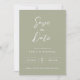 Unsere stilvolle Save the Date Hochzeitskarte ist perfekt für Ihre minimalistische und elegante Hochzeitsfeier. Eine schöne Verbindung von weißem Kalligraphie-Schriftart mit schlichtem und sauberem Text auf einem schlauen grünen Hintergrund sorgt für einen erhöhten Look, um Ihr stilvolles Ereignis zu ergänzen. Einfach & schnell, um sich mit Ihren eigenen Namen und Eheringsdetails.