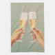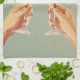 Zwei Hände mit Champagnerflöten in einem feierlichen Toast vor einem weichen pastellfarbenen Hintergrund. Die Szene fängt einen eleganten und fröhlichen Silvestermoment ein, wobei goldene Blasen in der Brille aufsteigen.