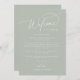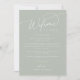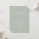 Dieses elegante, grüne Hochzeitsreisemodell eignet sich perfekt für eine einfache Hochzeit. Das moderne minimalistische Design besticht durch zeitlose pastellgrüne und romantische Kalligraphie mit böhmischem Märchenstil. Auf der Vorderseite des Begrüßungstafels befindet sich ein Begrüßungsbrief und auf der Rückseite befindet sich die Zeitachse für die Hochzeitsreise. Diese Noten sind ideal für Hochzeiten in Urlaubsort und Begrüßungstaschen für Hotelgäste.
