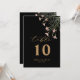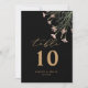 Eine freistehende Tischnummer mit feinen Wildblumen-Illustrationen auf schwarzem Hintergrund.