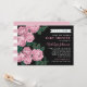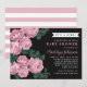 Stilvolle Baby Dusche Einladungen mit einer hübschen Blumenbildergestaltung von staubigen Rose / Lila rosa Garten Rose Blume mit reichen grünen Blätter vor einem weichen schwarzen Hintergrund. Der stylische, benutzerdefinierte Text kann für die von Ihnen geplante Veranstaltung vollständig personalisiert werden. Die Rückseite der Karte wird durch ein Muster weicher, horizontaler Streifen mit einem koordinierenden rosa Hintergrund abgedeckt.