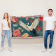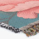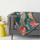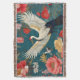 Eleganter Werfer mit einem chinoiserie-inspirierten Muster mit roten und rosa Pfannkuchen mit Kranen auf schieferblauem Hintergrund. Ideal für eine schicke orientalische Jugendstil-Wohngestaltung und um die unerwartete rote Touch zu Ihrem Interieur hinzuzufügen.