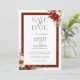 Dieses romantische und klassische Save the Date-Design zu Weihnachten oder im Winter bietet Haufen lebendiger Blume in Rot und Weiß, Kiefer, Heilige Beeren und rustikale Zweige, maßgeschneiderte, moderne Textgrafiken und bearbeitbare Textfelder, umgeben von einer reichen roten Damast-Grenze mit goldenen Kanten. Zurück enthält eine Fotovorlage.