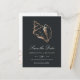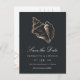 Informieren Sie sich über Ihre bevorstehende Hochzeitsreise, Ihren Strand oder Ihre tropische Inselhochzeit mit diesen schönen, im Sommer Save the Date Postkarten, die eine Muschel aus Kupferfolien auf einem weichen schwarzen Hintergrund mit Imitaten zeigen. Elegante weiße Schrift und Blockschrift zeigen Ihre Hochzeitdetails (Namen, Hochzeitstag und Ort); benutzen Sie die Rückseite um weitere Details wie Ihre Hochzeitswebsite zu teilen. Postkarten werden rückwärts angezeigt, um zusätzliche Save the Date Details zu zeigen, einschließlich Ihrer Hochzeitswebsite, mit Ihrer Rücksendeadresse und Platz für die Empfänger-Adresse, mit zwei zusätzlichen goldenen Muscheln versehen.