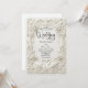 Verkünden Sie Ihre märchenhafte Verbindung mit diesem antiken inspirierten Design. Es zeigt eine romantische barocke Ästhetik und bietet den Look von Luxusskulpturen auf hochwertigem Papier. Dieses Design verfügt über eine fortschrittliche monochrome Farbpalette aus Creme, Elfenbein und sanftem Beige, die das Aussehen von geschnitztem Gips oder Kalkstein simuliert. Das Kunstwerk zeigt einen imitierten Basreliefrahmen, der mit klassischen architektonischen Säulen, aufwendiger Filigran-Ornamentik und blühenden Rosenzweigen verziert ist. Oben bilden zwei elegante Schwäne, die einander zugewandt sind, eine subtile Herzform, die auf einem Bett aus skulptierten Blumen ruht. Die Typografie wird in einer formalen, dunkelgrauen Schreib- und Serifenschrift dargestellt, die einen hohen Kontrast zum hellen Hintergrund bietet.