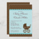 Beginnen Sie Ihren Jungen mit unserer eleganten Damaske mit der Baby-Baby-Baby-Babydusche. Die Einladung erfolgt mit einem stilvollen braunen Damast-Hintergrund mit einer Baby Blue Band und einer Jakobskante mit einer Vintagen braunen Babykutsche. ©Babystar Designs