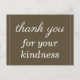 Dieses elegante, saubere Dankeschön Postcard Design beinhaltet die Nachricht "Danke für Ihre Freundlichkeit" auf der Vorderseite, zusammen mit einer anpassbaren Nachricht auf der Rückseite. Es könnte genutzt werden, um zu bieten, dank jemandem, der etwas Besonderes getan hat.