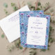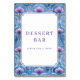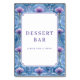 Dies ist ein Bild im Vintage-Stil mit einer eleganten Einladung für eine Dessertbar. Der Hintergrund zeigt komplizierte Blumenmuster in beruhigenden Blautönen und Violett, die eine luxuriöse und einladende Atmosphäre schaffen. In der Mitte kündigt ein sauberes weißes Rechteck mit fettem violetten Text "DESSERTBAR" an, gefolgt von einer charmanten Aufforderung: "BITTE NIMM EINEN LECKERBISSEN!" Es strahlt Raffinesse und Wärme aus und ist perfekt, um jeder Feier oder Veranstaltung einen Hauch von Klasse zu verleihen.
