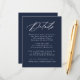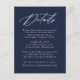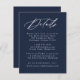 Unsere Hochzeitskollektion in Elegant Calligraphy verfügt über ein schönes, weißes Kalligraphieskript mit marinischem Hintergrund. Personalisieren Sie diese passende Hochzeitszimmerkarte mit wichtigen Hochzeitsdetails wie Hotelunterkunft, Hochzeitswebseite, Reisearrangements, Begrüßung von Empfängen und vieles mehr. Die dunkle Marinekarte für Hochzeitsfeiern eignet sich sowohl für lässige als auch für feierliche Hochzeiten zu jeder Jahreszeit.