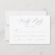 Einfache Hochzeitskarte mit einem modernen dustigen blauen Kalligraphieskript mit weißem Hintergrund (oder Farbe Ihrer Wahl). Personalisieren Sie die staubblaue RSVP-Karte mit Ihrem gewünschten Antwortzeitpunkt, akzeptieren/verweigern Sie den Text und wählen Sie das Menü aus. Die RSVP-Karte für das kalligraphische Mahl wurde entworfen, um sich mit unserer Hochzeitskollektion Elegant Calligraphy abzustimmen.