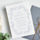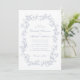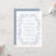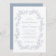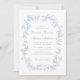 Elegante Hochzeitseinladung mit einem verzierten, Vintagen Aquarellrahmen, der aus staubblauen, zarten Chinoiserie-Stilfloralen und Blätter besteht. Die Namen der Braut und des Bräutigams befinden sich in einem staubblauen Skript, und die Einzelheiten der Hochzeiten sind in einem einfachen, staubigen, blauen Buchstaben. Ideal für Paare, die sich die populäre, großtausendjährige Ästhetik zu Eigen machen und die Romantik vergangener Zeiten mit einer erfrischend zeitgenössischen Touch verbinden.