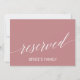 Dieses elegante, staubige Kalligraphiezeichen "reserviert" ist perfekt für eine Rose. Die Karte ist zweiseitig (beidseitig gedruckt). Das neutrale Design besticht durch eine minimalistische Karte, die mit romantischer und skurriler Typografie auf einem staubigen rosa Hintergrund dekoriert ist. Benutzen Sie diese Karten, um Stühle oder Tische bei Ihrer Hochzeitsfeier, Empfang oder jeder Veranstaltung zu reservieren.