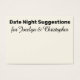 Hier gibt es ein lustiges Accessoire, das Sie für Ihre Verlobungsfeier oder die gemeinsame Dusche abholen können: Dates Nacht Sugtionskarten, auf denen die Gäste persönliche Notizen an Braut und Bräutigam schreiben können. Auf der Vorderseite lesen Sie "Date Night Suggestions" in einem fett formatierten, serifenlosen Schriftart; diese Schrift ist bearbeitbar, sodass Sie eine andere auswählen können, wenn Sie es vorziehen... oder sogar eine andere Nachricht schreiben möchten. Unten finden Sie einen Ort für Ihre Namen; diese erscheinen in einem hübschen Skript, das auch leicht zu ändern ist. Ändern Sie den Hintergrund in eine beliebige Farbe, die Sie bevorzugen!. Bitte zögern Sie nicht, mich zu kontaktieren, wenn Sie besondere Wünsche haben oder andere Artikel benötigen. Gerne helfe ich Ihnen auch bei der Anpassung dieser Karten. //