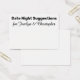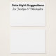 Hier gibt es ein lustiges Accessoire, das Sie für Ihre Verlobungsfeier oder die gemeinsame Dusche abholen können: Dates Nacht Sugtionskarten, auf denen die Gäste persönliche Notizen an Braut und Bräutigam schreiben können. Auf der Vorderseite lesen Sie "Date Night Suggestions" in einem fett formatierten, serifenlosen Schriftart; diese Schrift ist bearbeitbar, sodass Sie eine andere auswählen können, wenn Sie es vorziehen... oder sogar eine andere Nachricht schreiben möchten. Unten finden Sie einen Ort für Ihre Namen; diese erscheinen in einem hübschen Skript, das auch leicht zu ändern ist. Ändern Sie den Hintergrund in eine beliebige Farbe, die Sie bevorzugen!. Bitte zögern Sie nicht, mich zu kontaktieren, wenn Sie besondere Wünsche haben oder andere Artikel benötigen. Gerne helfe ich Ihnen auch bei der Anpassung dieser Karten. //