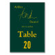 Die elegante Tischnummer in Grün und Gold eignet sich ideal für eine Hochzeit mit modernem Ambiente, das schlichte Design zeichnet sich durch eine elegante Goldkalligraphie auf grünem Hintergrund aus.