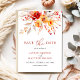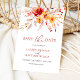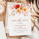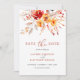 Diese schlichte und elegante Hochzeit im Herbst Save the Date im Design besticht durch ein lebendiges und natürliches Blumenstrauß, Blätter und Beeren in Sonnenuntergangstönen von Orangen, Pfirsichen und Taupes, die für Ihre Herbsthochzeit eine romantische Boho-Eleganz schaffen. Die Erwärmung der Aquarellfloralen an der Vorderseite ist perfekt mit elegantem Serifentext auf weißem Hintergrund gepaart, um einen hellen und raffinierten Look zu schaffen. Eine reiche Rostorange bedeckt das Gegenteil für eine komplementäre Oberfläche. Ideal, um Ihren besonderen Tag mit einem eleganten Herbstcharakter zu gestalten!