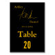 Die elegante Tischnummer in Schwarz und Gold eignet sich perfekt für eine moderne Hochzeit und bietet eine elegante Goldkalligraphie auf schwarzem Hintergrund.