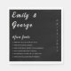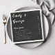 Diese elegante, schwarz-weiße Hochzeitsserviette eignet sich perfekt für eine moderne Hochzeit. Das schlichte Design zeichnet sich durch elegante weiße Kalligraphie der Braut- und Bräutigamen, das Datum der Hochzeit und lustige Fakten auf schwarzem Hintergrund aus.