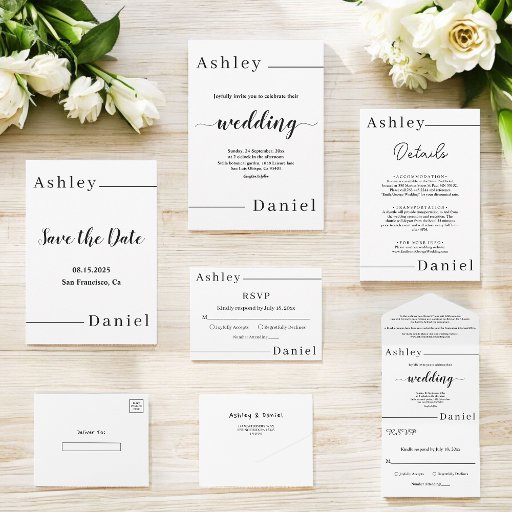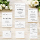 Dieses elegante Schwarz-Weiß-Hochzeitsinspekt eignet sich perfekt für eine moderne Hochzeit, das schlichte Design zeichnet sich durch elegante schwarze Kalligraphie auf weißem Hintergrund aus.