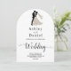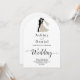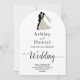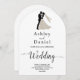 Diese elegante Schwarzweiß-Bogenhochzeit lädt zu einer modernen Hochzeit ein. Das einfache Design zeichnet sich durch eine elegante schwarze Kalligraphie und eine Braut- und Bräutigam-Illustration auf einem sauberen, weißen Hintergrund aus. Die Einladungskarte enthält die Hochzeitsdetails auf der Rückseite, anstatt für eine separate Kapselkarte zu bezahlen.