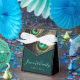 Schöne königsblaue und smaragdgrüne und goldene Pfauenschachteln Gastgeschenk Hochzeit. Sie können diese elegante königliche, aquamarine blaue und smaragdgrüne Pfauenfederkiste mit Ihrem Text im Schriftart-Stil, den Sie möchten, eine Hintergrundfarbe hinzufügen und die Farbbandfarbe ändern.