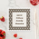 Personalisieren Sie Ihr Wiedersehen-Dinner oder Picknick mit diesen personalisierten Servietten. Das Polodot-Muster weist elegante silberne Kreise auf dunkelbraunem Hintergrund auf. Ein großes Rechteck in der Mitte ist braun und beige und bietet einen soliden Hintergrund für Ihre personalisierten Wiedersehen-Informationen. Schnell und einfach das Jahr und Ihren Familiennamen anpassen.