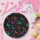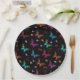 Teller aus Papier mit elegantem Muster und einer grafischen Abbildung flatternder Schmetterlinge in vielen hellen Farbtönen, kontrastierend sehr schön auf dem schwarzen Hintergrund. Whimsikale Blumen, Zierspieße und Blätter verleihen dem Raum einen gewissen Charme.