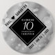 Celebrate the 10th tin wedding anniversary with this stylish button! Elegant black and white lettering with hexagonal confetti on a foil background add a memorable touch for this special chance and milestone. Personalize with the paar's names and date of marriage. Design © W.H. Sim. See more at zazzle.com/expressionsoccasions