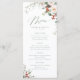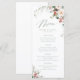 Elegantes Wasserfarben-Blumendesign aus weißen Rosen, Pinienzapfen, Beeren und Eukalyptusgrün mit moderner stilvoller Schrift. Festliche Farbpaletten in Rot, Salbeigrün und Weiß. Große personalisierte Menüs für die Weihnachts-Hochzeit, die Landhochzeit und die boho-florale Weihnachtshochzeit im Winter.