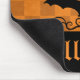 Eine wunderschön elegante schwarze Fledermaus-Silhouette auf einem orangefarbenen karierten Muster auf schwarzem Hintergrund. Dieses Design umfasst Wirbel für die Scrollarbeit und die gotische Schrift. Hier auf einem Mauspad zu Halloween.