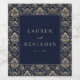 Dies ist ein Bild im klassischen Stil mit einer eleganten Hochzeitseinladung mit komplizierten Blumenmustern in Gold und Marineblau. Das zentrale dunkelblaue Paneel zeigt die Namen "Lauren und Benjamin" zusammen mit ihrem besonderen Datum, dem 23. Mai 2026, in anspruchsvoller weißer Schrift. Das umgebende aufwendige Blumendesign verleiht eine zeitlose Eleganz und Luxus, wodurch es perfekt ist, um den Ton für eine große Feier zu setzen. Es weckt Gefühle von Romantik und Raffinesse, ideal für diejenigen, die ein traditionelles, aber stilvolles Hochzeitsthema suchen.