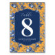 Dies ist ein Bild im Vintage-Stil, das eine elegante Tischnummernkarte zeigt, perfekt für eine Hochzeit oder eine formelle Veranstaltung. Der tiefblaue Hintergrund kontrastiert schön mit dem lebendigen orangefarbenen Blumenmuster, das ihn umgibt, und schafft eine anspruchsvolle und einladende Atmosphäre. Die große weiße "8" sticht hervor, während die Namen "Lauren & Benjamin" und das Datum "23. Mai 2026" eine persönliche Note hinzufügen. Es ist ideal, um den Ton für Ihren besonderen Anlass romantisch und stilvoll zu setzen.