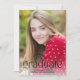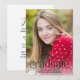 Diese minimalistische Abschluss-Karte zeichnet sich durch trendige Typografie und ein großes Foto aus. An der Vorderseite ist "Graduate" in einzigartiger schwarzer Schrift mit einem großen blühte geschrieben. Das Abschluss Jahr wird in den blüh gesetzt, und der Name und die Schule des Absolventen sind unten. Das Typografiedesign überlagert ein großes vertikales Foto. Auf der Rückseite der Abschluss-Karte befindet sich eine Vorlage zum Hinzufügen von Gruppenangaben für Graduiertengruppen.