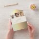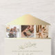 Elegante, moderne, minimalistische Gold All-in-One Hochzeitseinladung mit Monogramm - Initialen von Braut und Bräutigam, einfache Kalligraphie-Skript und angepasste vier Bilder des Paares. Fügen Sie Ihre Fotos, Website und QR-Code hinzu - für UAWG und weitere Informationen.