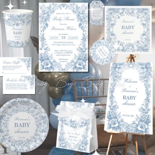 Elegante französische Toilchinoiserie barocke Vintage Gartenanlage botanische staubblaue Babydusche mit Monogramm Servietten Vorlage personalisiert Babyduschtisch Dekoration kundenspezifisch staubblaue botanische Servietten personalisierte Name Servietten bedruckte Servietten Babydusche Geschirr Babydusche Party Zubehör