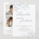 Set die Bühne für ein unvergessliches Fest mit dieser eleganten französischen Blumenfotografie Collage Wedding Einladung. Mit einem staubblauen Toile de Jouy-Design und Kalligraphie-Schrift verbindet diese Einladung zeitlose Eleganz mit einer modernen Touch. Eine Collage aus dem Foto präsentiert hochgeschätzte Erinnerungen, während der enthaltene QR-Code einen nahtlosen Zugang zu UAWG oder zusätzlichen Hochzeitsdetails garantiert und somit perfekt für die technisch versierten Paare von heute ist. Ob als Textnachrichteneid oder als druckbarer Sake, diese luxuriöse Hochzeitseinladung strahlt Raffinesse aus. Seine klassische Vintage Ästhetik zeichne Inspiration aus den französischen Blumenmustern, die ein romantisches und regales Design schaffen. Features: Foto Collage für eine persönliche Touch. Integrierter QR-Code für den Komfort. Elegante dustige blaue Toile de Jouy Blumenmuster. Raffiniertes Kalligraphieskript. Vielseitiges Format für ausgehende oder gedruckte Einladungen Illustrationen kann Gegenstand der KI sein