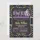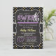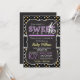 Niedlich Sweet 16, 16, Einladung auf gelbe, schwarze und graue Sterne, sterniges Nachtmuster mit lila Rack-Designelementen. 16., 16. Geburtstagsparty für Mädchen. Vintag fühlen sich mädchenhaft lila und gelb Kreide Schriftart auf coolem schwarzen Brett Hintergrund.